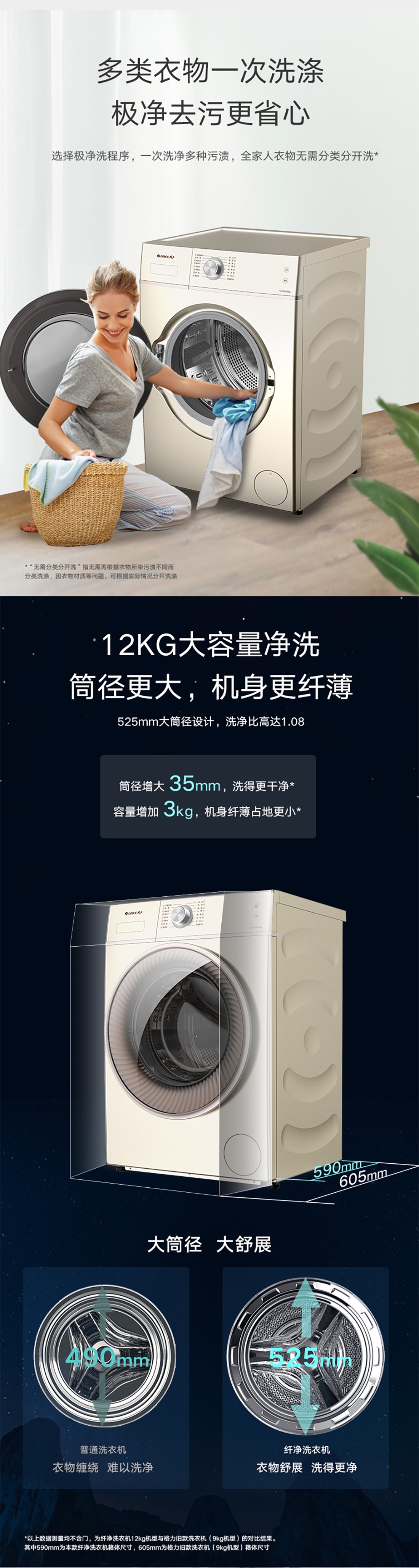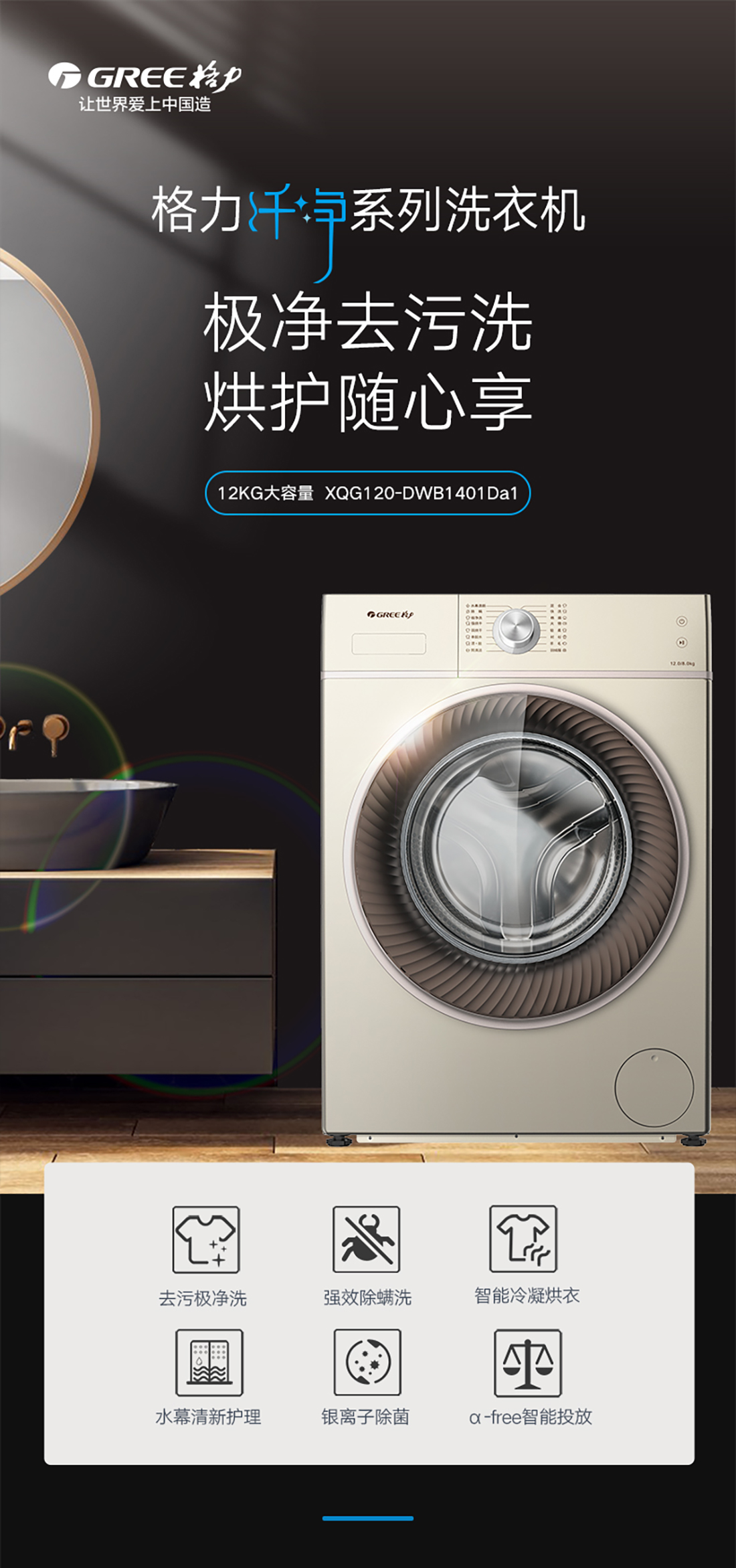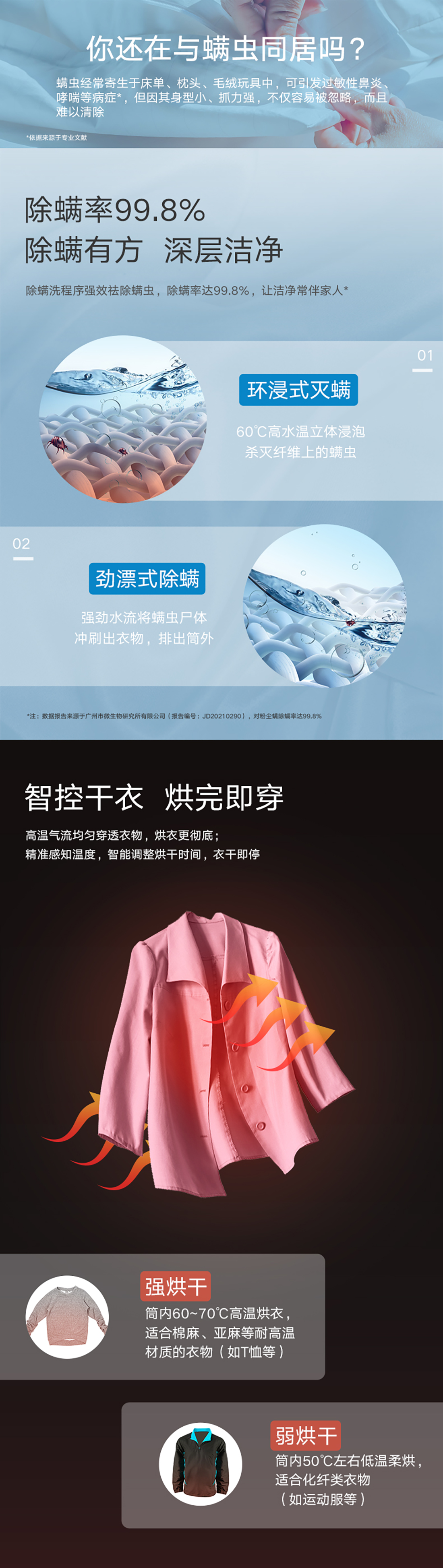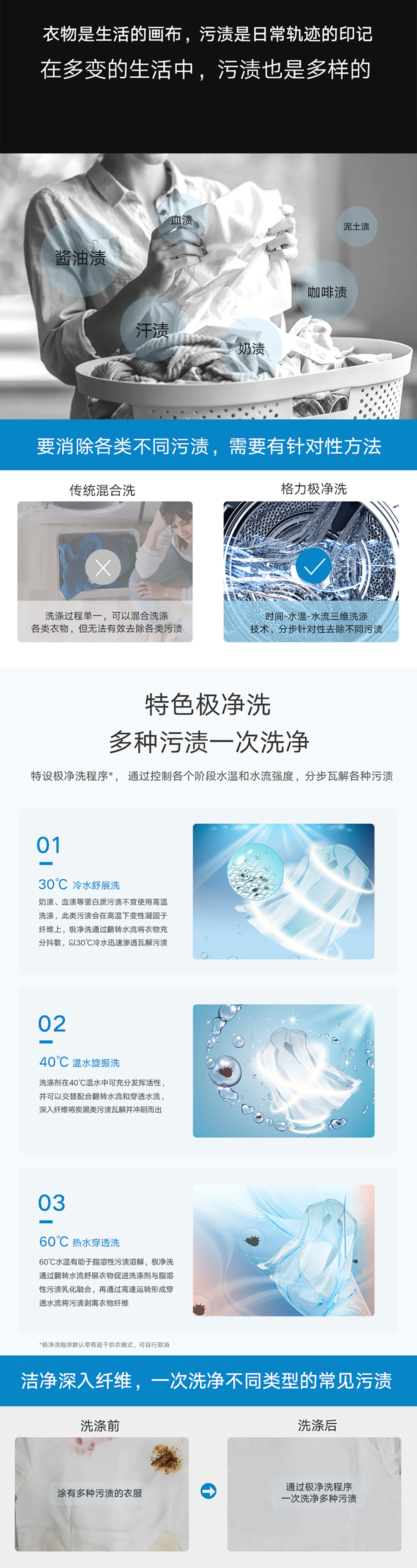 極凈去污,一次洗凈多類污漬;大容量,全家人衣物無需分類分開洗;洗烘一體,即洗即烘即穿.