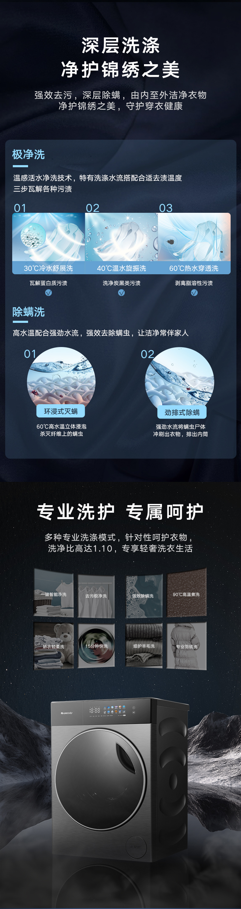 AI智能感應,臟污一鍵洗凈。AI慧眼識污,智能判斷洗滌凈度,洗凈比高達1.1