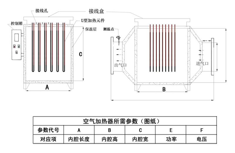 空氣加熱器主要用于風道中的空氣加熱,規格分低溫、中溫、高溫三種型式,在結構上的共同之處是采用了鋼板支撐電熱管以減少風機停止時電熱管的震動,在接線盒中都裝有超溫控制裝置。低溫型可直接安裝在風道上,而中溫型、高溫型由于結構上的不同,在通道外壁至加熱器接線盒夾有100mm厚的保溫材料,一方面減少整個通道的對外散熱,另一方面也減少了接線腔內的溫度。