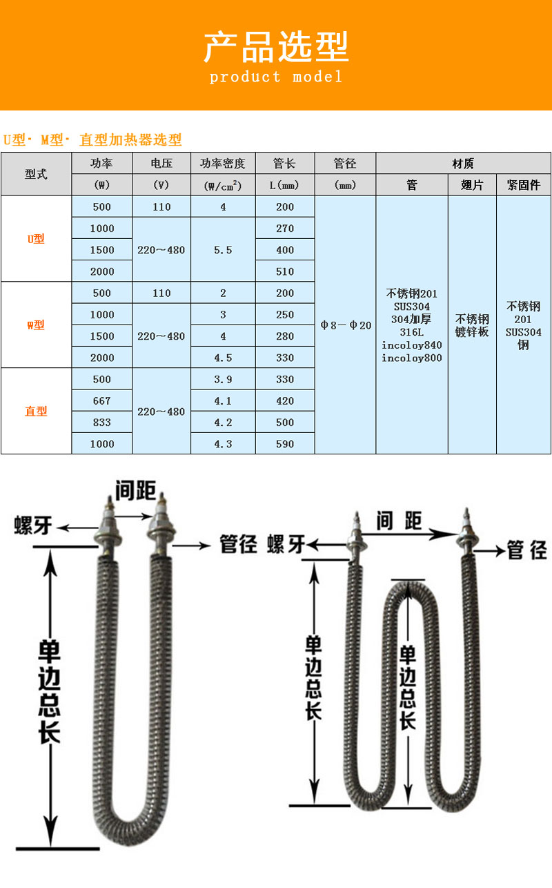 W型翅片空氣電加熱管采用優質不銹鋼、進口氧化鏷粉、高電阻電熱合金絲、不銹鋼散熱片等材料,通過先進的生產設備和工藝制作而成,翅片電加熱管可以安裝在吹風管道中或其它靜止、流動空氣的加熱場合。它與普通加熱管相比,散熱面積擴大了2~3倍,即翅片元件所允許的表面功率負荷是普通元件的3~4倍。由于元件的長度縮短,使得本身的熱損失減小,在相同的功率條件下,具有升溫快、發熱均勻、散熱性能好、熱效率高、使用壽命長、加熱裝置體積小,成本低等優點。根據用戶要求進行了合理的設計,便于安裝。產品在機械制造、汽車、紡織、食品、家電等行業,尤其在空調器風幕行業得到廣泛應用。