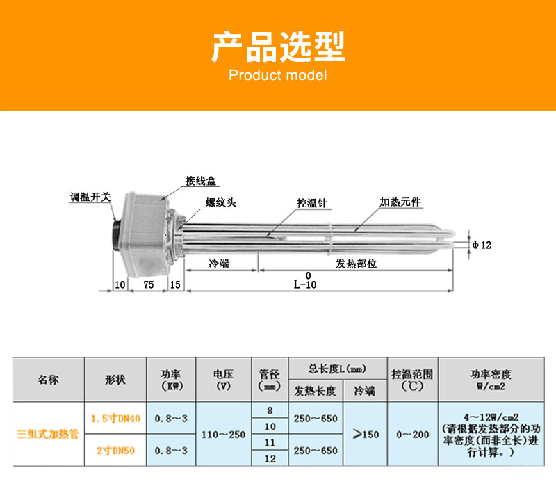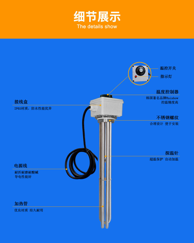 自動控溫節能模溫機電加熱管,內含不銹鋼電熱管,EGO 溫度控制器,開關和指示燈等組成,可根據液體、溶液、重油等的溫度需要進行自動加溫,保證機械運作正常,節省電力輸出,減少損失能量,是電鍍槽體、染色槽、酸洗槽等液體加熱的首選。可根據使用場合選擇法蘭加熱管、螺紋發熱管、鈦加熱管、單頭加熱棒、鐵氟龍電熱管等各種加熱設備。